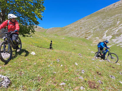 Una volta partiti e superato il primo km (a circa 1550 m), con la magnifica vista sulla destra della Serra Santa Maria, s’imbocca una comoda sterrata che con qualche tornante e poi in saliscendi (si toccano 1630 m) abbraccia il Monte Godi. È lui il protagonista di questa prima parte. Nelle giornate limpide, sempre nei primi km, sarà facile scorgere tra le fronde dei primi faggi il profilo inconfondibile del Corno Grande. Dopo questo inizio sinuoso la sterrata incontra una prima ampia zona di pascolo con il caratteristico Stazzo di Ziomas 1565 m. che chiude il prologo. Ancora oggi utilizzato dai pastori è punto di riferimento importante anche per gli escursionisti e segna nettamente il percorso che ora punta dritto verso il maestoso Monte Marsicano. Da questo punto e per tutta la parte centrale del giro si affronta un incremento di difficoltà sia del livello tecnico di guida che delle pendenze di salite e discese, come anticipato è la parte più alpinistica del giro. Subito il fondo sassoso impegna a trovare la giusta traiettoria per arrivare ad una piccola cresta a 1610 m. preludio di una adrenalinica picchiata lungo la monumentale Serra di Ziomas. Come sempre, in questi casi, nulla vieta di percorrere i punti più difficili conducendo la bici a mano (Non siamo in gara). Terminata la discesa (a 1541 m.) la strada s’impenna di nuovo entrando in una splendida faggeta che termina in un’altra radura spesso frequentata da cavalli bradi. Il giro dopo questa breve parentesi torna a salire costringendo a proseguire a piedi per un centinaio di metri per giungere alla quota massima del giro a 1705 m. Lo sforzo sarà ampiamente ricompensato dalla splendida piana con il secondo rifugio (sempre aperto) della giornata che invita ad una piacevolissima sosta. Il pascolo per la sua bellezza merita una piccola descrizione: situato sui 1700 m. è incastonato subito sotto il passo della Corte e altre vette di 2000 m. Ospita, come accennato, lo stazzo di Campo Rotondo attrezzato al meglio per offrire dalla semplice tazza di caffè al pernottamento (di fortuna). La zona è teatro di splendide scialpinistiche che suggeriscono proprio il tratto successivo della gita. Con molta attenzione si procede liberi da sentieri disegnando un cerchio attorno ad un colle fino a riprendere un piccolo tratto fatto all’andata. Superata una parte di discesa che potrebbe anche questa risultare impegnativa, si arriva ad un incrocio e ad incontrare le sorgenti del torrente Tasso. Il percorso segue per ampi tratti il corso d’acqua scendendo in direzione Scanno. S’incontra una ottima azienda bio casearia e un bar-ristorante utile per una sosta prima di chiudere la seconda parte del percorso. È qui che s’innesta la variante che arricchisce di bellezza e impegno il tracciato originale da me proposto. A quota 1136 m si continua, in discesa, lungo la provinciale in un susseguirsi di tonanti e curve fino a giungere ai limiti del paese di Scanno. Si giunge ad un bivio per piegare bruscamente e incunearsi nella stretta gola detta Fosso di Jovana. Passato il guado di acqua cristallina del fiume Sagittario, a circa 975 m, si procede inerpicandosi tra imponenti bastioni naturali seguendo il Fosso citato e il torrente omonimo con lo scorrere veloce dell’acqua come colonna sonora. È qui che inizia la terza e ultima frazione dell’escursione con la salita finale di circa 12 km con circa 600 m di dislivello. Inizialmente rettilinea la sterrata sale decisa con uno strappo importante che in due tornanti e un dosso fa entrare nella parte più aperta del Vallone delle Masserie. Si accede così a verdi pascoli (bassi nel confronto con quelli percorsi nella prima parte) e al bel Agriturismo Jovana con la possibilità di godere di ampi scenari dove su tutto domina il Monte Genzana di 2170 m. e della Serra Sparvera di 2034 m. La sosta è d’obbligo grazie alla squisita gestione familiare che garantisce la vendita di prodotti della valle. Si riparte superando la Chiesetta di San Lorenzo con la strada che s’impenna passando sotto le antiche vestigia della Torre Jovana severa custode di questo pagus* già abitato agli inizi del XV secolo. Si comprende che seppure difronte ad uno sterrato quasi perfetto si deve prestare attenzione nel dosare con attenzione lo sforzo di questa frazione finale. Con una serie di ampi tornanti e un piccolo ponte ci si riavvicina al corso del torrente fino a raggiungerne le sorgenti sull’ ultimo pascolo dov’è presente un fontanile. Tutto ciò anticipa, con il risalire di quota, alla faggeta e al Valico della Cantoniera Mimola. Lasciata la sterrata si procede sulla provinciale, per raggiungere nuovamente passo Godi dopo circa 2 km e terminando in dolce discesa di 1,5 km giusto per sciogliere le gambe e chiudere questa strepitosa escursione.